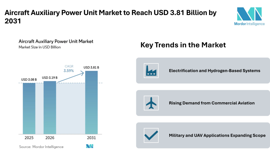 According to the Mordor Intelligence, the aircraft auxiliary power unit market size is expected to grow from USD 3.08 billion in 2025 to USD 3.19 billion in 2026, and further reach USD 3.81 billion by 2031, registering a CAGR of 3.59% during the forecast period. The market is steadily expanding as airlines, defense operators, and aircraft manufacturers adapt to changing operational and environmental requirements.