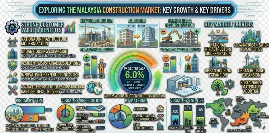 Within the market’s sector breakdown, residential construction holds the largest share — driven by housing demand from a growing urban population and the government’s affordable housing initiatives targeting middle- and lower-income groups. Infrastructure construction follows closely, anchored by spending on roads, rail, ports, and utilities that underpin Malaysia’s broader economic connectivity goals.