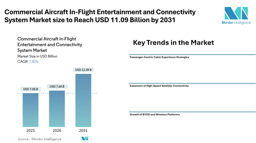According to Mordor Intelligence, the commercial aircraft in-flight entertainment and connectivity system market size was valued at USD 7.05 billion in 2025 and is projected to grow from USD 7.60 billion in 2026 to reach USD 11.09 billion by 2031, registering a CAGR of 7.85% during the forecast period. The commercial aircraft in-flight entertainment and connectivity system market forecast reflects airlines’ increasing focus on improving onboard digital services to strengthen passenger loyalty and generate ancillary revenue.