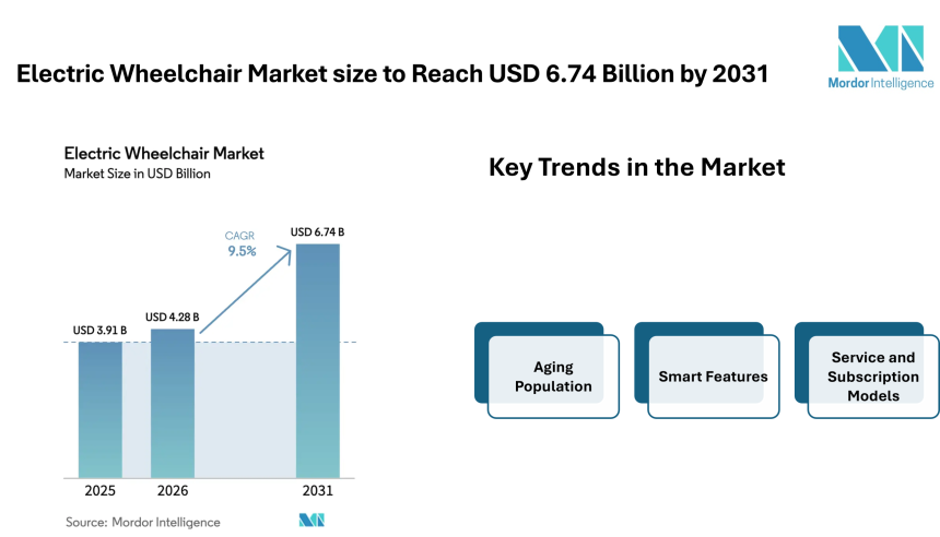 According to Mordor Intelligence, the electric wheelchair market size is estimated at USD 4.28 billion in 2026, rising from USD 3.91 billion in 2025, and is projected to reach USD 6.74 billion by 2031, reflecting a steady expansion with a 9.5% CAGR during the forecast period. These figures highlight the steady electric wheelchair market growth supported by demographic changes, healthcare needs, and improvements in assistive mobility equipment.