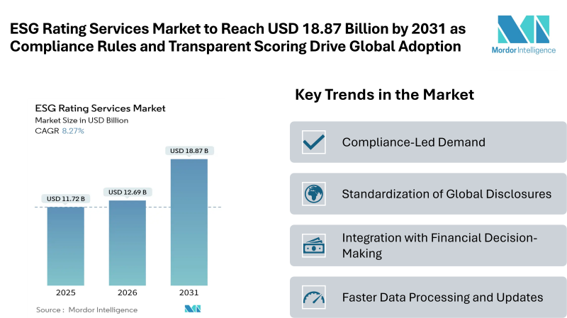 The ESG rating services market size was valued at USD 11.72 billion in 2025 and is estimated at USD 12.69 billion in 2026, with the market forecast indicating it will reach USD 18.87 billion by 2031, growing at a CAGR of 8.27%. This trajectory highlights steady market growth supported by compliance-driven demand, expanding disclosure frameworks, and rising investor scrutiny. Across the ESG rating services industry, institutions are moving away from narrative sustainability reporting toward structured, measurable disclosures. Regulatory bodies worldwide are mandating standardized reporting formats, which increases the need for reliable ratings, datasets, analytics, and verification tools.