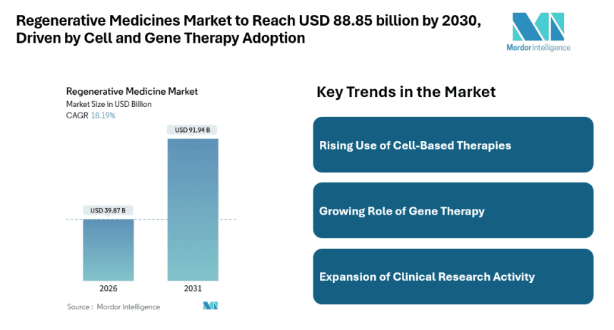 The regenerative medicines market is gaining strong momentum as healthcare systems focus on therapies that repair, replace, or regenerate damaged tissues and organs. According to Mordor Intelligence, The Regenerative Medicine Market size is estimated at USD 37.98 billion in 2025, and is expected to reach USD 88.85 billion by 2030, at a CAGR of 18.10% during the forecast period (2025-2030), reflecting steady expansion supported by clinical progress and wider acceptance of regenerative approaches. These therapies are increasingly used to address chronic diseases, genetic disorders, and injuries where conventional treatments offer limited outcomes.