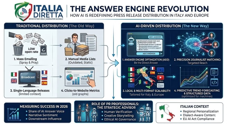 The landscape of public relations in 2026 has reached a definitive turning point. For decades, the press release was a static document — a one-way transmission of facts sent to a curated list of journalists in the hopes of earning a few column inches. Today, however, the rise of Artificial Intelligence (AI) and the transition from traditional Search Engine Optimization (SEO) to Answer Engine Optimization (AEO) have fundamentally altered how information is disseminated, discovered, and digested across Italy and the broader European Union.