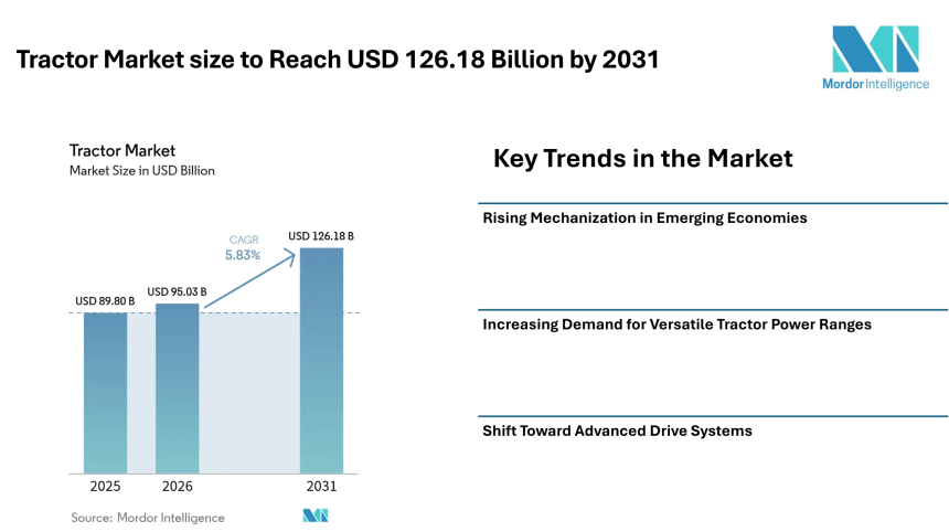According to Mordor Intelligence, the tractor market size is estimated at USD 95.03 billion in 2026, increasing from USD 89.8 billion in 2025, and is projected to reach USD 126.18 billion by 2031, registering a CAGR of 5.83% during the forecast period.