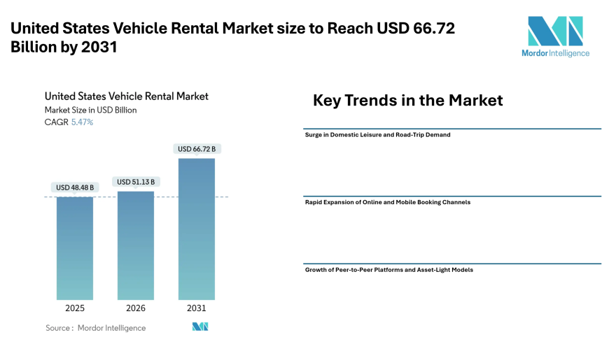 According to Mordor Intelligence, the United States vehicle rental market size is projected to grow from USD 48.48 billion in 2025 to USD 51.13 billion in 2026 and is expected to reach USD 66.72 billion by 2031, registering a CAGR of 5.47% during the forecast period. The United States vehicle rental market forecast reflects steady expansion supported by leisure travel recovery, hybrid work patterns, and a rising shift toward digital platforms.